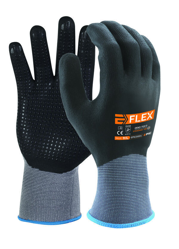 Gants support tricoté polyamide/spandex. Jauge 15. Enduction totale micromousse de nitrile avec picots sur la paume. Poignet tricot élastiqué. | Utilisés pour les travaux en milieux gras et huileux.