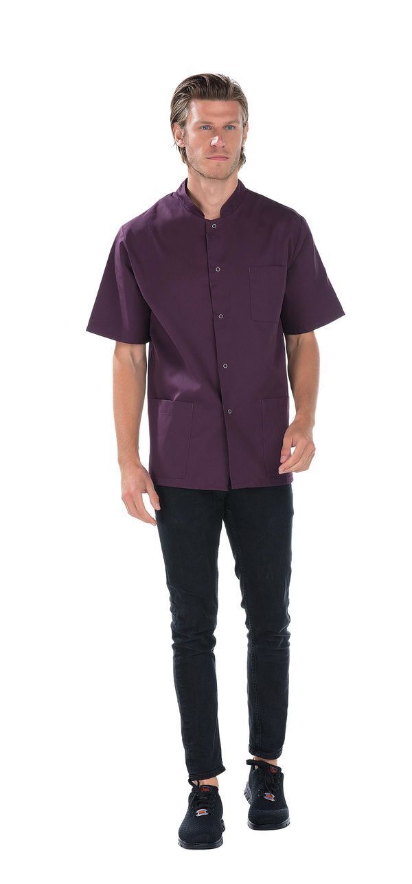 Tunique mixte. Col mao. Fermeture milieu devant par boutons-pression. 2 poches basses. Poche poitrine. Manches courtes. Fentes côtés. Longueur : 75 cm.