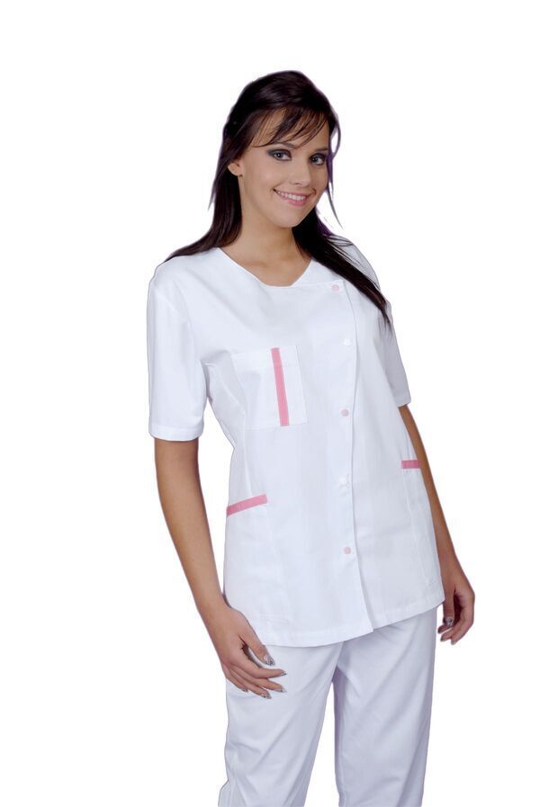 Tunique femme. Encolure V. Fermeture asymétrique par boutons-pression contrastées. Poche poitrine avec compartiment stylo, 2 poches basses. Manches courtes. Longueur : 75 cm.
