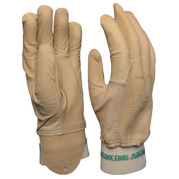 Gants pleine fleur flanc de bovin hydrofuge. Pouce palmé. Poignet bord-côte élastiqué en polyamide avec renfort protège artère.