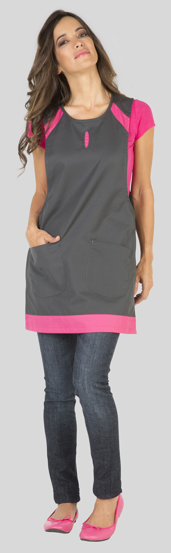 Chasuble femme. Encolure ronde ton sur ton. Fermeture côtés par pattes à grippers. Empiècements contrastés aux épaules et goutte. 2 poches basses. Finition bas de pièce par bande contrastée. Longueur : 80 cm.