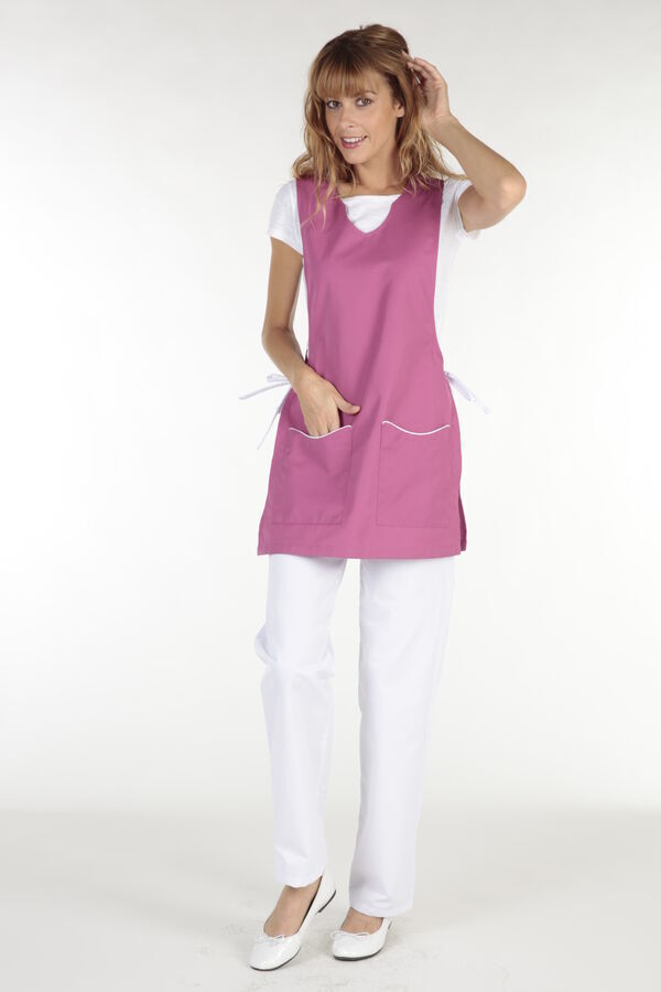 Chasuble femme. Encolure fantaisie ton sur ton. 2 poches basses plaquées avec passepoil contrasté. Fermetures côtés par lacets. Fentes côtés. Longueur : 75 cm.