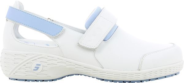Chaussures non sécurité avec talon arrière fermé. Semelle intérieure amovible acceptant une semelle orthopédique. Dessus cuir et doublure en Coolmax®. Bride réglable par velcro. Semelle en EVA/caoutchouc, légère (250 g), flexible et antidérapante. Talon : 4 cm. Talon compensé : respect de la physiologie du dos et positionnement naturel du bassin.